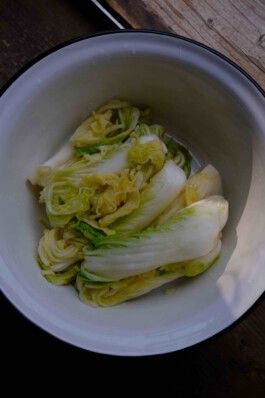 I try to make kimchi and sauerkraut at least twice a year. In case you've never tried to make kimchi yourself, I dearly recommend you Maangchi‘s recipe ↗. You need napa cabbage, daikon radish, carrot, ginger, scallions, garlic, chili flakes, sugar, rice flour and — salt. If you'd like to try the pancakes with sauerkraut and make your own first you can check my sauerkraut recipe here ↗.