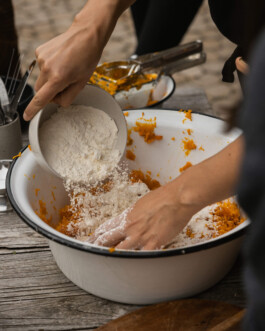 Step 3: Now you can peel the baked pumpkin slices and place them in a potato press, they should still be warm. Add flour and a pinch of salt to a bowl and now gently knead the ingredients with your hands into a smooth dough.